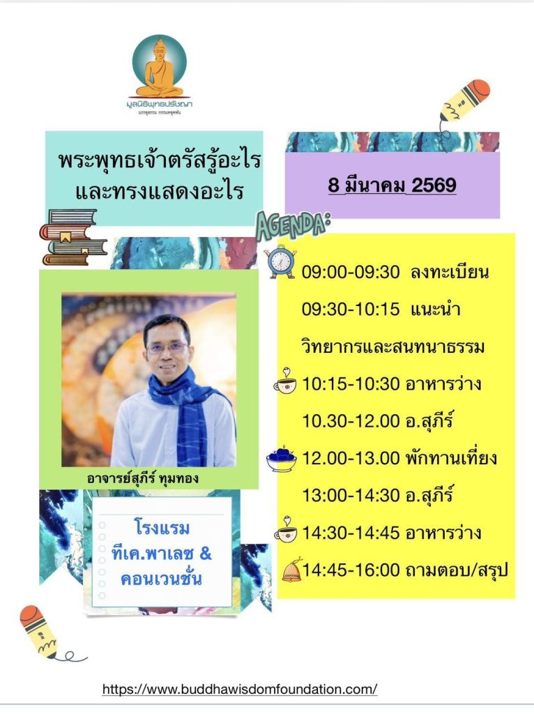 มูลนิธิพุทธปรัชญา จัดบรรยายธรรมโดยอาจารย์ สุภีร์ ทุมทอง หัวข้อ “พระพุทธเจ้าตรัสรู้อะไรและทรงแสดงอะไร” วันที่ 8 มีนาคม 2569 ที่โรงแรม ทีเค.พาเลซ&คอนเวนชั่น